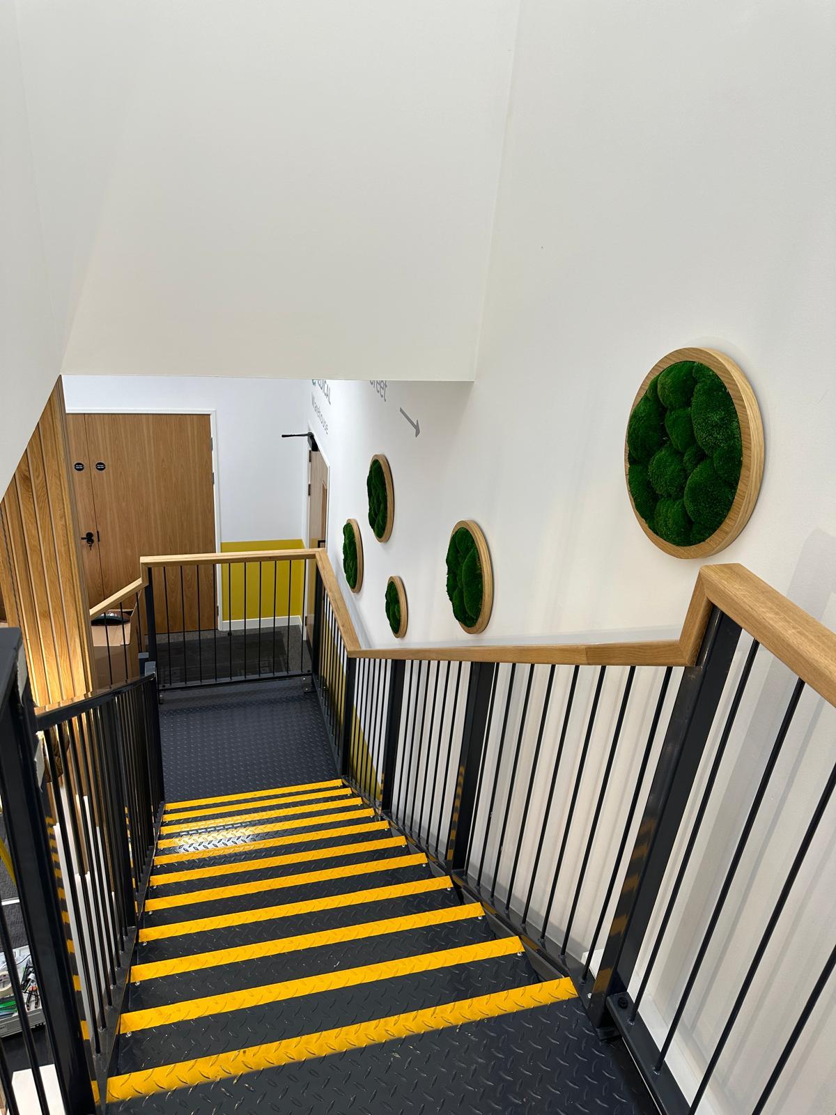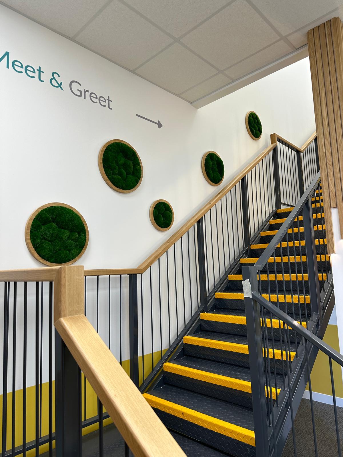 The installation of moss discs can make a significant impact on any space. The oak veneer framing, for instance, can add a touch of sophistication to the overall design. The vibrant green moss discs bring a refreshing natural element into the environment, creating a more inviting and pleasant atmosphere for both employees and visitors in a commercial setting, or for family and guests in a residential one.