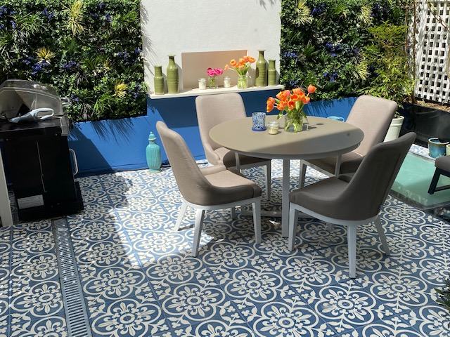 The project was a resounding success. The once-small and plain courtyard was transformed into a vibrant, low-maintenance oasis. The Milan green wall panels, paired with the colourful mosaic tiles, created a serene and inviting outdoor space.