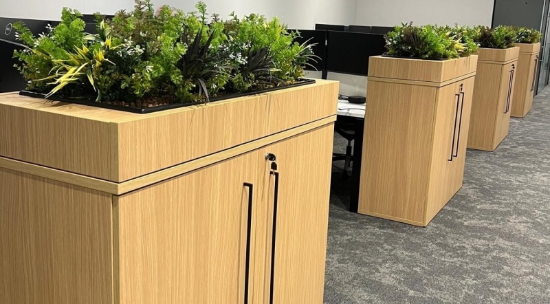 We installed stylish desk cabinets with integrated planters – one of the most sought-after design trends right now – to add greenery at eye level while saving space. In the kitchen, we introduced lush shelf planting for a subtle refresh, and created a soft green partition using minimalist planting on elegant curved shelving. The result is a workspace that feels calm, clean, and connected.