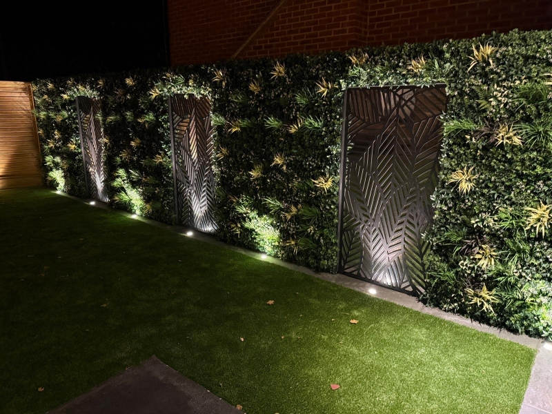 Complementing the mirrors, luxury artificial green walls was used to bring texture and natural vibrancy — without the ongoing maintenance of live plants. Carefully positioned ambient lighting completed the transformation, introducing a dramatic, cinematic quality that takes over as the sun sets.