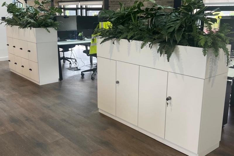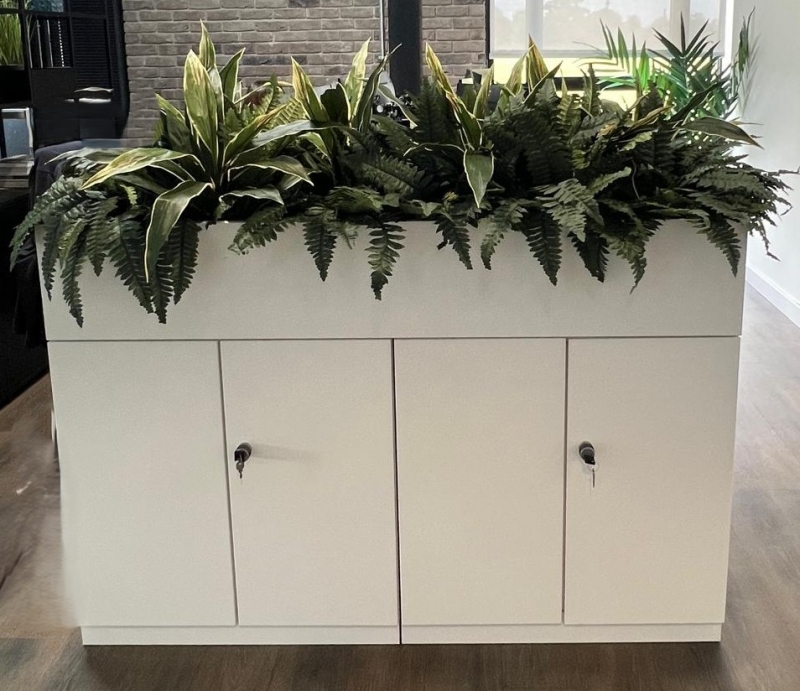 While greenery was a priority for the client, live plants weren’t a practical option due to limited access to natural light and the absence of a facilities team to maintain them. Additionally, floor space was limited, so any greenery had to be seamlessly incorporated into the office furniture without cluttering the space. The challenge was to design and install a solution that delivered all the aesthetic and wellness benefits of natural planting—without the upkeep or spatial compromise.