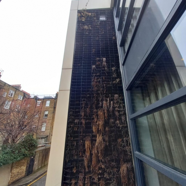 *Struggling Green Wall*: The original living green wall in Chelsea was fading and struggling to thrive, diminishing the aesthetic appeal of the outdoor space. *High Maintenance*: Maintaining a healthy green wall was proving to be a costly and time-consuming endeavour. *Fire Safety Concerns*: The need for fire safety compliance was a paramount concern for the property owner.