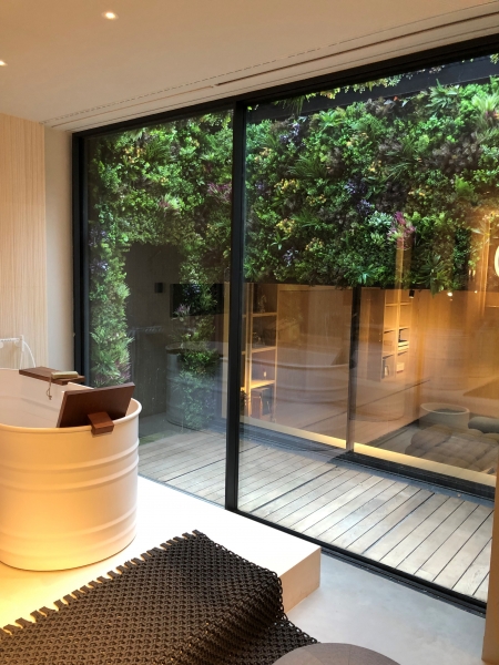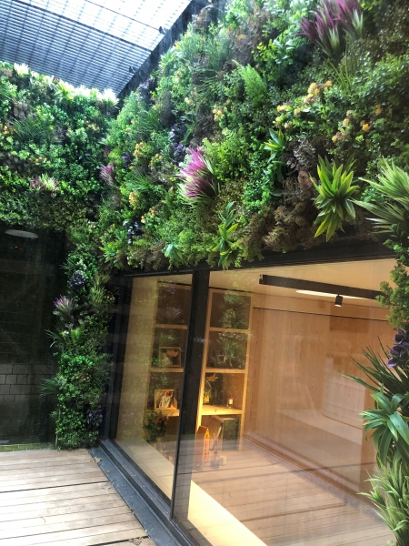 We used our bespoke designed GE Paris and GE Monaco artificial wall panels together to create a stylish approach to transform and disguise the dull concrete wall between the rooms. Now you can see the lavish green walls from every room in the basement.